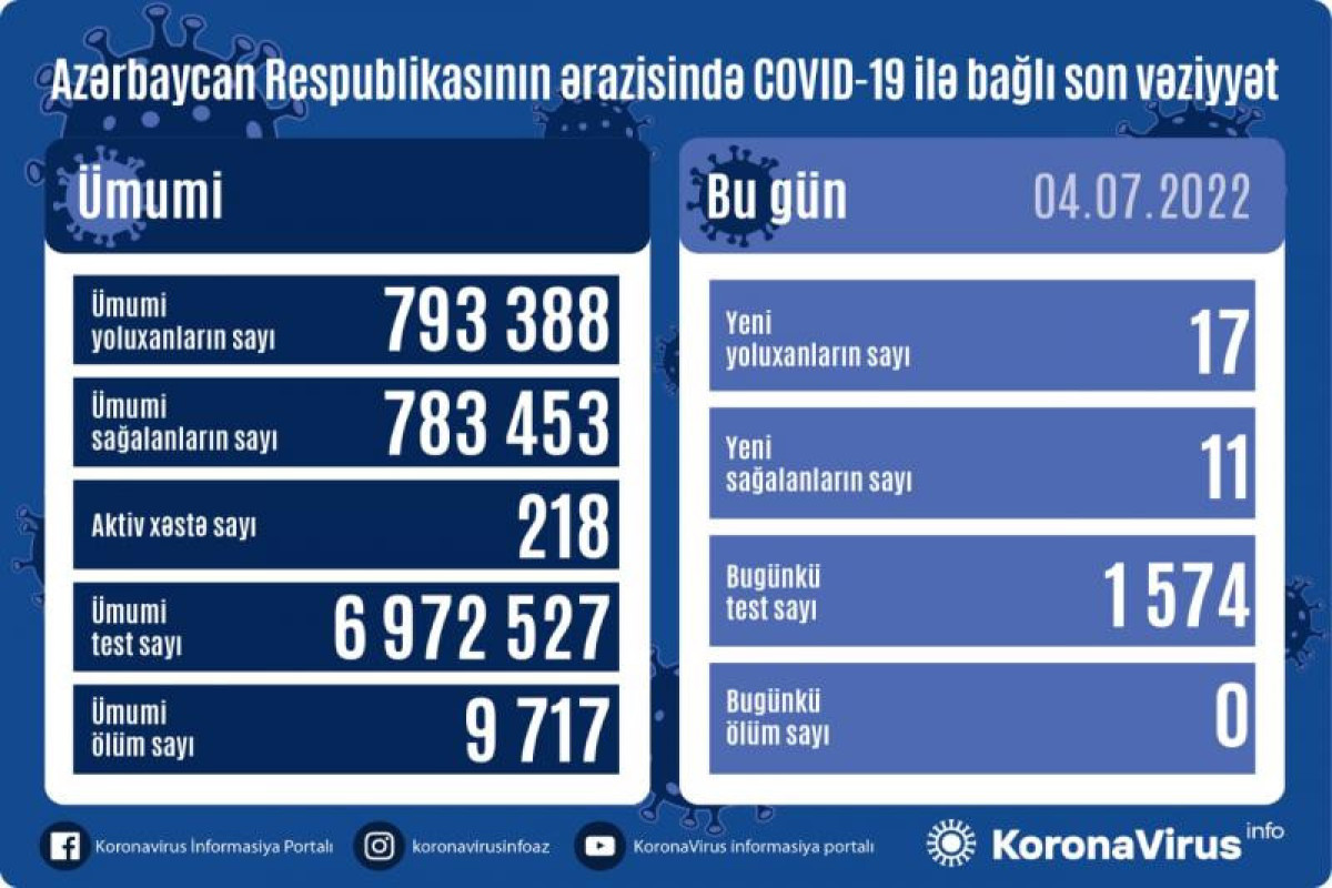Azərbaycan Respublikasında koronavirus (COVID-19) infeksiyasına 17 yeni yoluxma faktı qeydə alınıb, 11 nəfər müalicə olunaraq sağalıb.