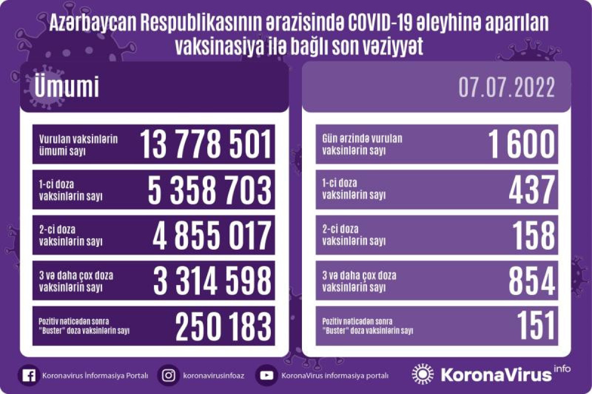 Azərbaycanda son sutkada koronavirus (COVID-19) əleyhinə 1600 vaksin vurulub. Bir gündə birinci mərhələ üzrə vaksinasiya olunanların sayı 437, ikinci mərhələ üzrə vaksinasiya olunanların sayı 158, üç və daha çox doza üzrə vaksinasiya olunanların sayı 854, pozitiv nəticədən sonra buster doza üzrə vaksinasiya olunanların sayı 151 nəfərdir.