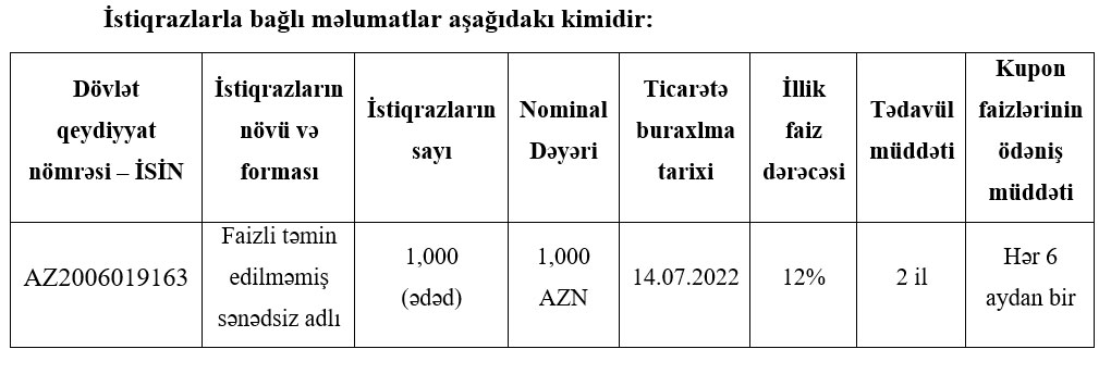 Faizli təmin edilməmiş sənədsiz adlı istiqrazların sayı 1000 ədəd, hər birinin nominal dəyəri 1000 manat, illik faiz dərəcəsi 12%, tədavül müddəti 2 il, kupon faizlərinin ödəniş müddəti hər 6 aydan birdir.