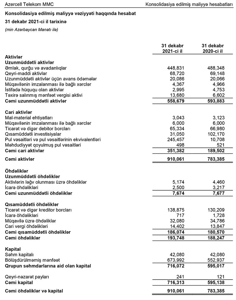 31 Dekabr 2021-ci il tarixində "Azercell Telekom" MMC 673 milyon 992 min manat bölüşdürülməmiş xalis mənfəətə malik olub.