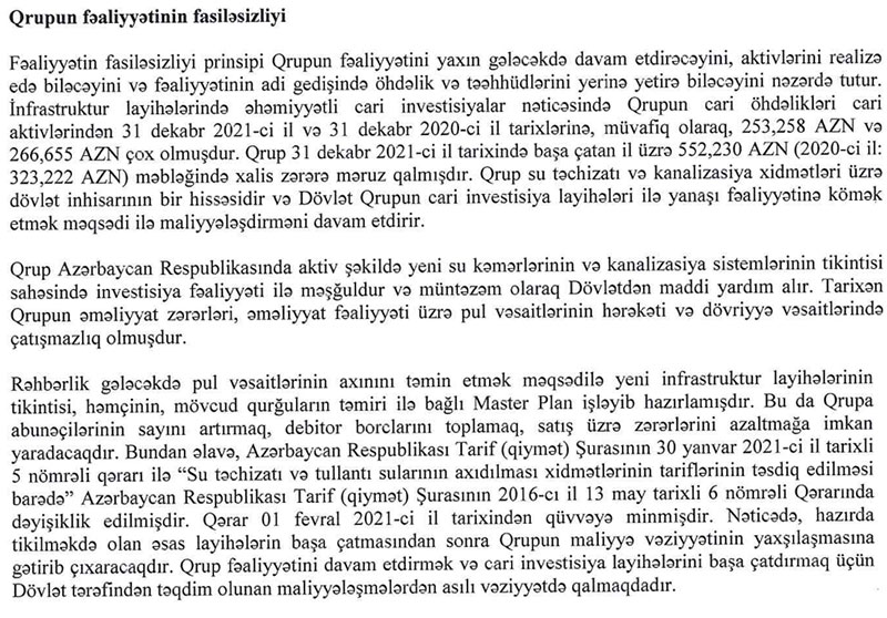"Azərsu" ASC 2021-ci ili 552 milyon 230 min manat xalis zərər ilə başa vurub. Halbuki, dövlət şirkəti 2020-ci ili 323 milyon 222 min manat xalis zərər ilə bağlamışdı. Beləliklə, "Azərsu" ASC-nin xalis zərəri 229 milyon 8 min manat və ya 70,8% artıb.