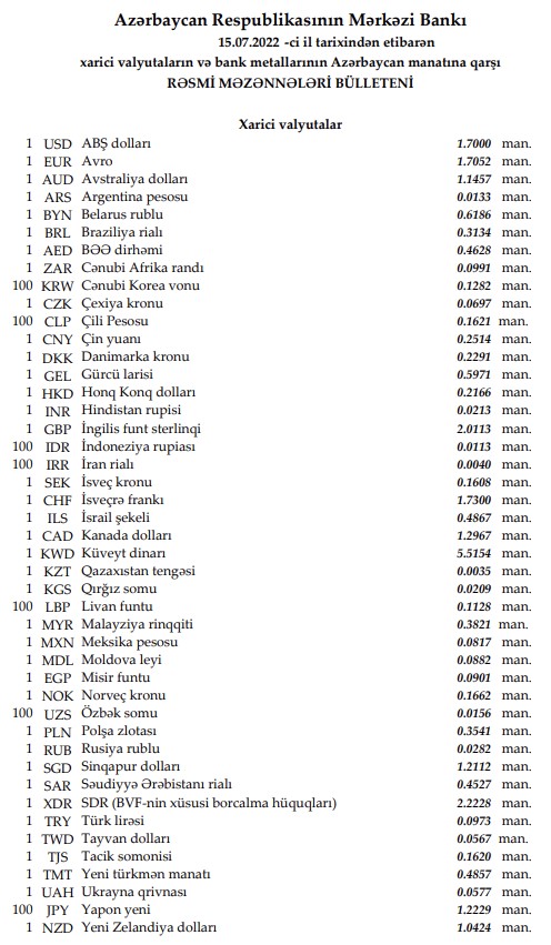 Dolların bazar ertəsi üçün rəsmi məzənnəsi müəyyən olunub