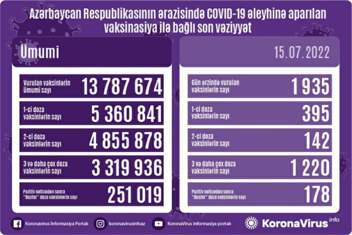 Azərbaycanda indiyədək ümumilikdə 794 247 nəfərin koronavirus infeksiyasına yoluxması faktı müəyyən edilib. Onlardan 783 874 nəfər müalicə olunaraq sağalıb, 9 723 nəfər vəfat edib, aktiv xəstə sayı 650 nəfərdir.