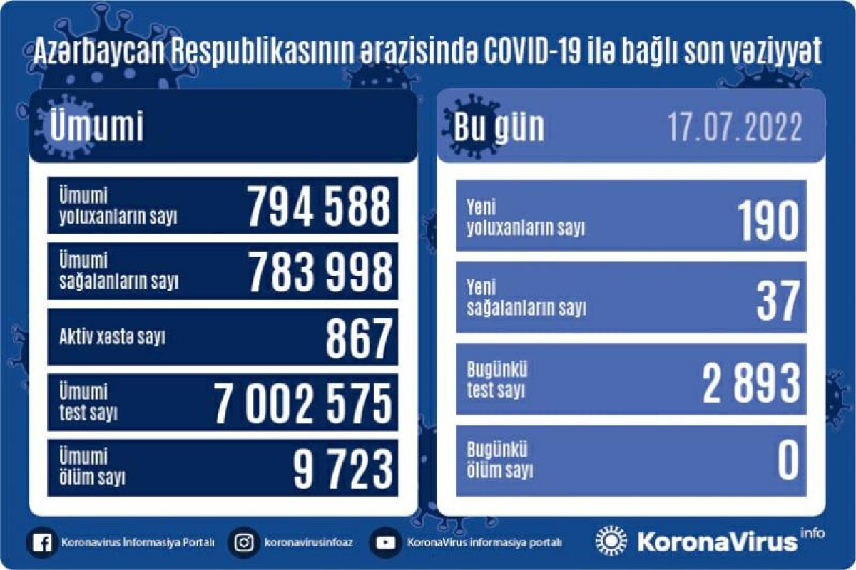 Azərbaycan Respublikasında koronavirus (COVID-19) infeksiyasına 190 yeni yoluxma faktı qeydə alınıb, 37 nəfər müalicə olunaraq sağalıb.
