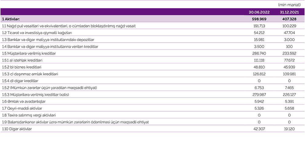 30 İyun 2022-ci il tarixində "Azər-Türk Bank" 598 milyon 969 min manat cəmi aktivlərə, o cümlədən 286 milyon 740 min manat kredit portfelinə (müştərilərə verilmiş kreditlər) malik olub. Bank 2021-ci ilin sonunda 407 milyon 328 min manat cəmi aktivlərə, o cümlədən 233 milyon 592 min manat kredit portfelinə malik idi.