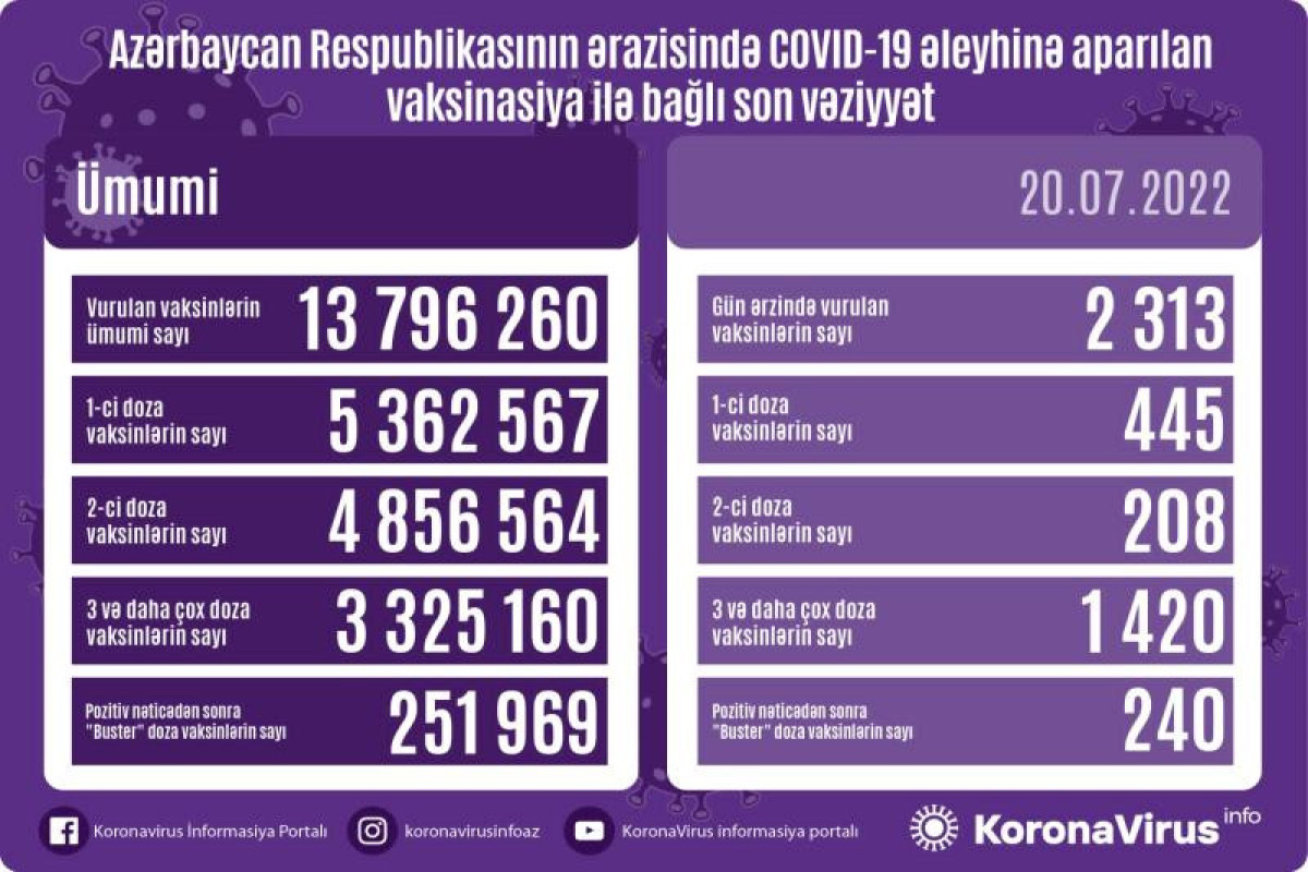 Azərbaycanda son sutkada koronavirus (COVID-19) əleyhinə 2313 vaksin vurulub. Bir gündə birinci mərhələ üzrə vaksinasiya olunanların sayı 445, ikinci mərhələ üzrə vaksinasiya olunanların sayı 208, üç və daha çox doza üzrə vaksinasiya olunanların sayı 1420, pozitiv nəticədən sonra buster doza üzrə vaksinasiya olunanların sayı 240 nəfərdir.