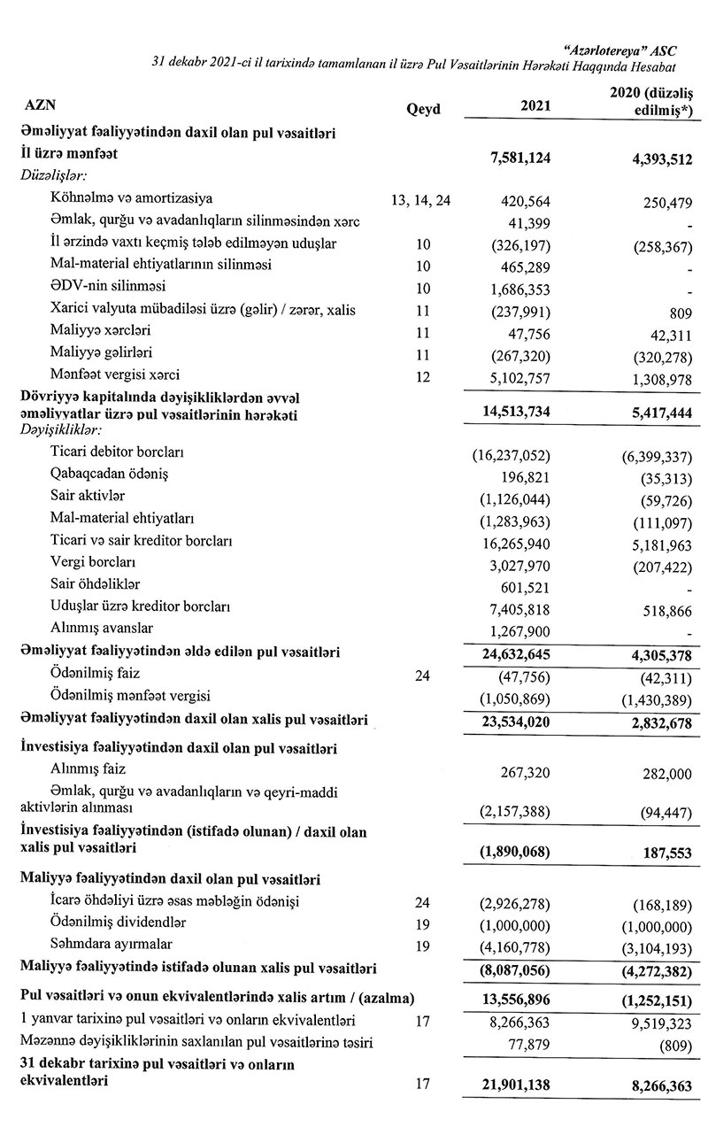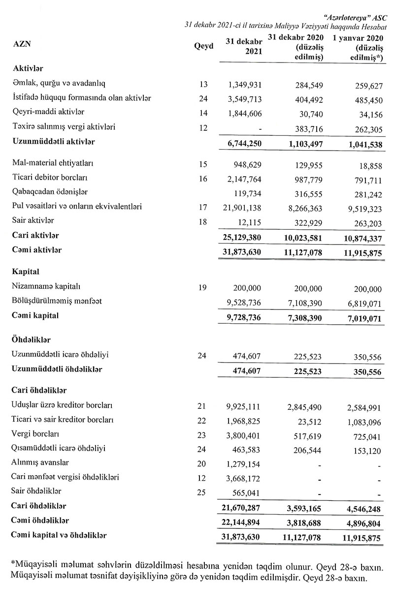 "“Azərlotereya ASC” 2021-ci ildəki fəaliyyəti ilə bağlı yaranmış bütün vergi öhdəliklərini qanunvericiliyə uyğun olaraq zamanında ödənmişdir və 2021-ci il ilə bağlı hər hansı bir vergi öhdəliyi qalmamışdır. İllik audit olunmuş hesabatın nəticələrində qeyd olunan vergi öhdəlikləri, ödəniş vaxtı 2022-ci ilin 31 Mart tarixinədək olan vergi öhdəlikləridir",- Şirkətdən veriləm məlumatda bildirilir.