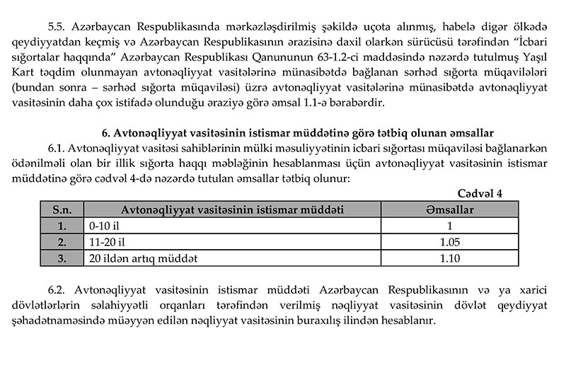 O qeyd edib ki, baza sığorta haqqı, yəni 50 manat dəyişdirilmir və olduğu kimi qalır. Lakin, risk səviyyəsinə görə baza sığorta haqqına yeni əmsallar tətbiq edilir:
