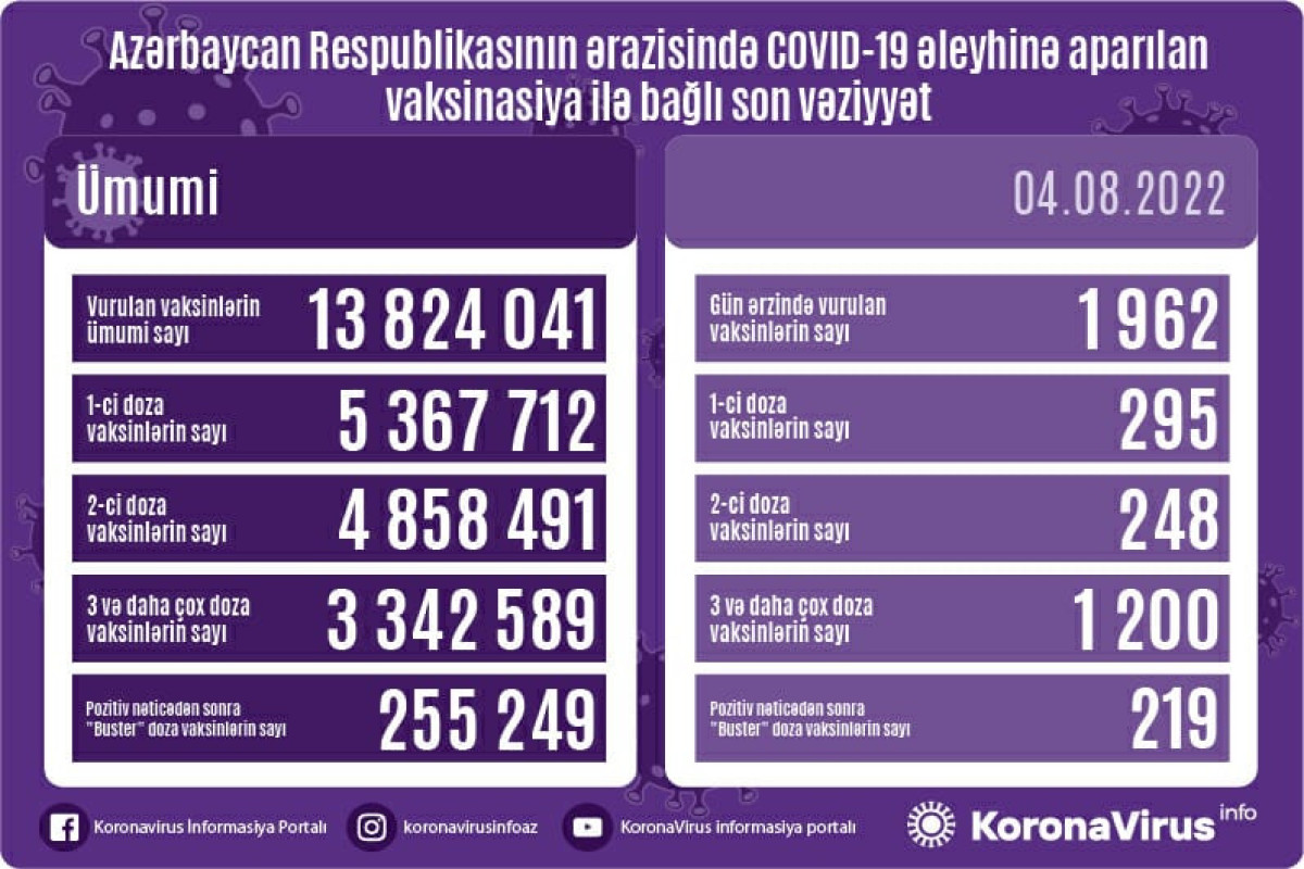 Azərbaycanda son sutkada koronavirus (COVID-19) əleyhinə 1 962 vaksin vurulub. Bir gündə birinci mərhələ üzrə vaksinasiya olunanların sayı 295, ikinci mərhələ üzrə vaksinasiya olunanların sayı 248, üç və daha çox doza üzrə vaksinasiya olunanların sayı 1200, pozitiv nəticədən sonra buster doza üzrə vaksinasiya olunanların sayı 219 nəfərdir.