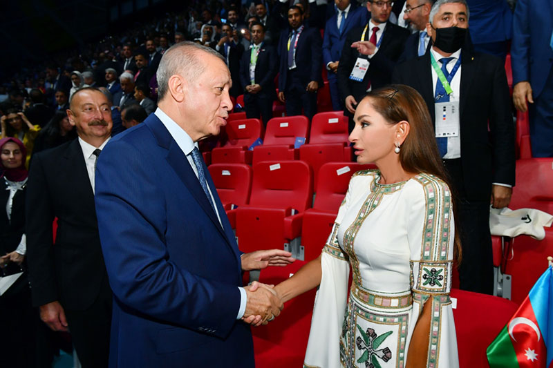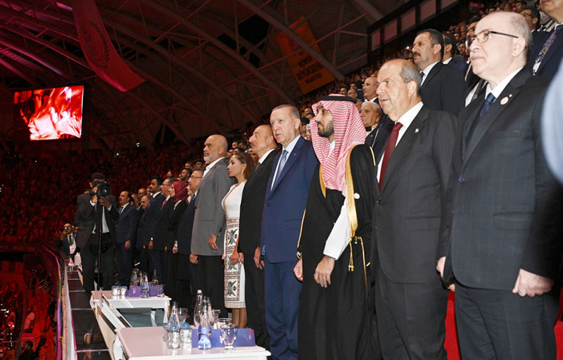 Bu möhtəşəm tədbirin tamaşaçıları arenaya daxil olan Türkiyə Prezidenti Rəcəb Tayyib Ərdoğanı, Azərbaycan Prezidenti İlham Əliyevi, digər dövlət və hökumət başçılarını hərarətlə alqışladılar.