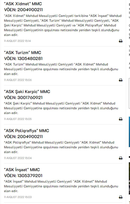 "Azərbaycan Sənaye Korporasiyası" ASC-yə (ASK) məxsus "ASK Xidmət”, “ASK İnşaat”, "ASK Turizm", "ASK Şəki Kərpic", "ASK Poliqrafiya" MMC-lər birləşdirilib.