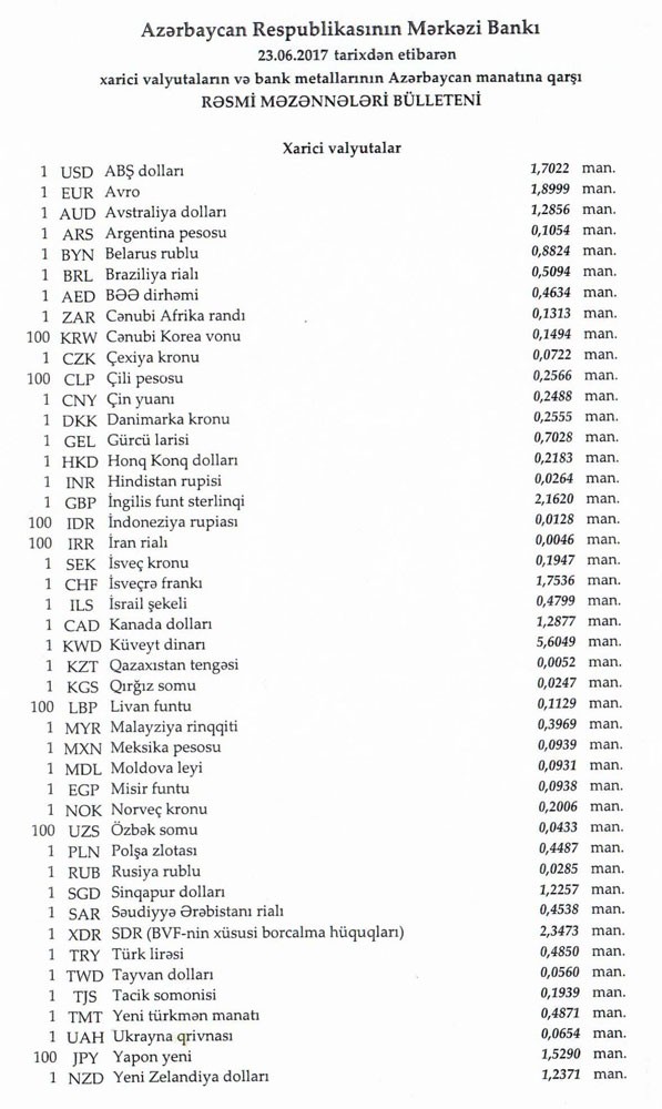 İyunun 23-nə Mərkəzi Bankın açıqladığı rəsmi Dollar/manat məzənnəsi İyunun 22-si ilə müqayisədə dəyişməyərək 1,7022 manat olub, Avro/manat məzənnəsi 1.8999 manata düşüb.