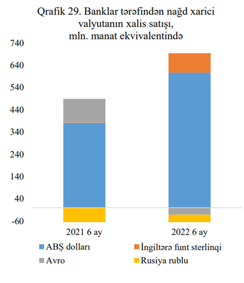 Banklar tərəfindən nağd xarici valyutanın alqı-satqısı üzrə aparılmış əməliyyatların həcmi ötən ilin müvafiq dövrünə nəzərən 38.2% artaraq 2.6 mlrd. ABŞ dolları ekvivalentində olmuşdur. Bunun 87.6%-ni ABŞ dolları ilə aparılmış əməliyyatlar təşkil etmişdir. I rübdə baş verən yüksək satışlar hesabına nağd xarici valyutanın xalis satışı 6 ayda ötən ilin müvafiq dövrünə nəzərən 40.8% artmışdır. Bununla belə aprel, may və iyun aylarında vəziyyət dəyişmiş və banklar tərəfindən xarici valyutanın alışı satışı üstələmişdir.