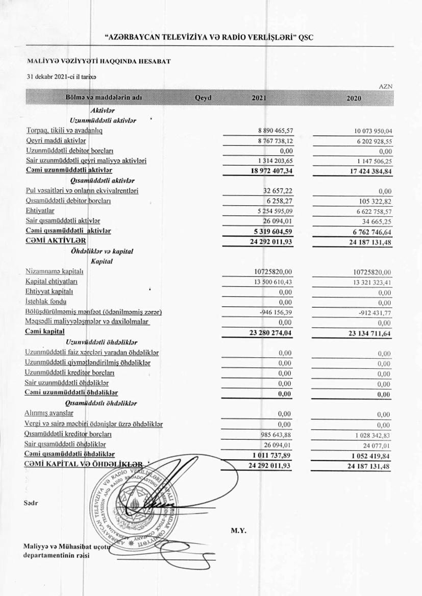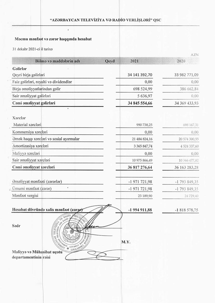 “Azərbaycan Televiziya və Radio Verilişləri” QSC (AzTV) 2021-ci ili 1 milyon 995 min manat xalis zərərlə başa vurub.