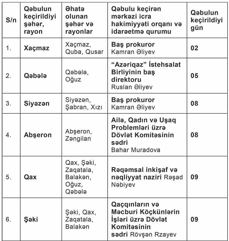 Vətəndaşların qəbulu müəyyən edilmiş günlərdə saat 10:00-da başlayır.