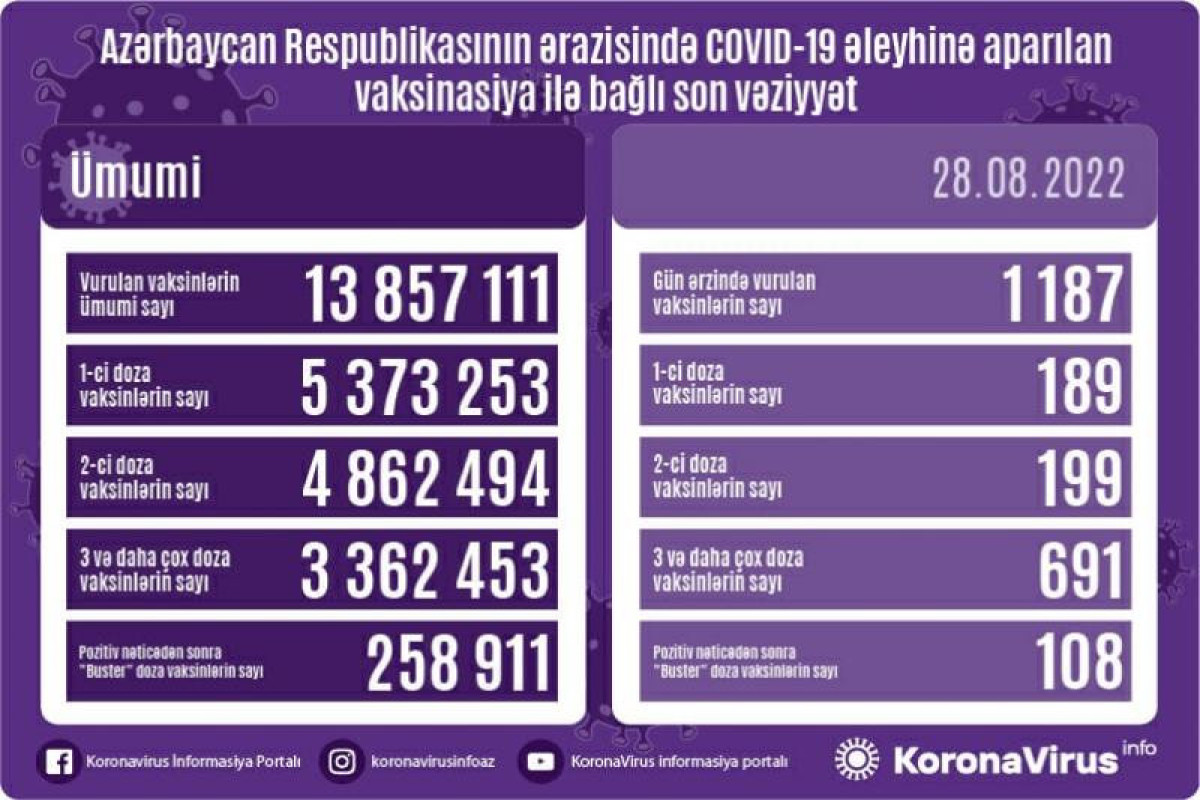 Azərbaycanda son sutkada koronavirus (COVID-19) əleyhinə 1 187 vaksin vurulub. Bir gündə birinci mərhələ üzrə vaksinasiya olunanların sayı 189, ikinci mərhələ üzrə vaksinasiya olunanların sayı 199, üç və daha çox doza üzrə vaksinasiya olunanların sayı 691, pozitiv nəticədən sonra buster doza üzrə vaksinasiya olunanların sayı 108 nəfərdir.