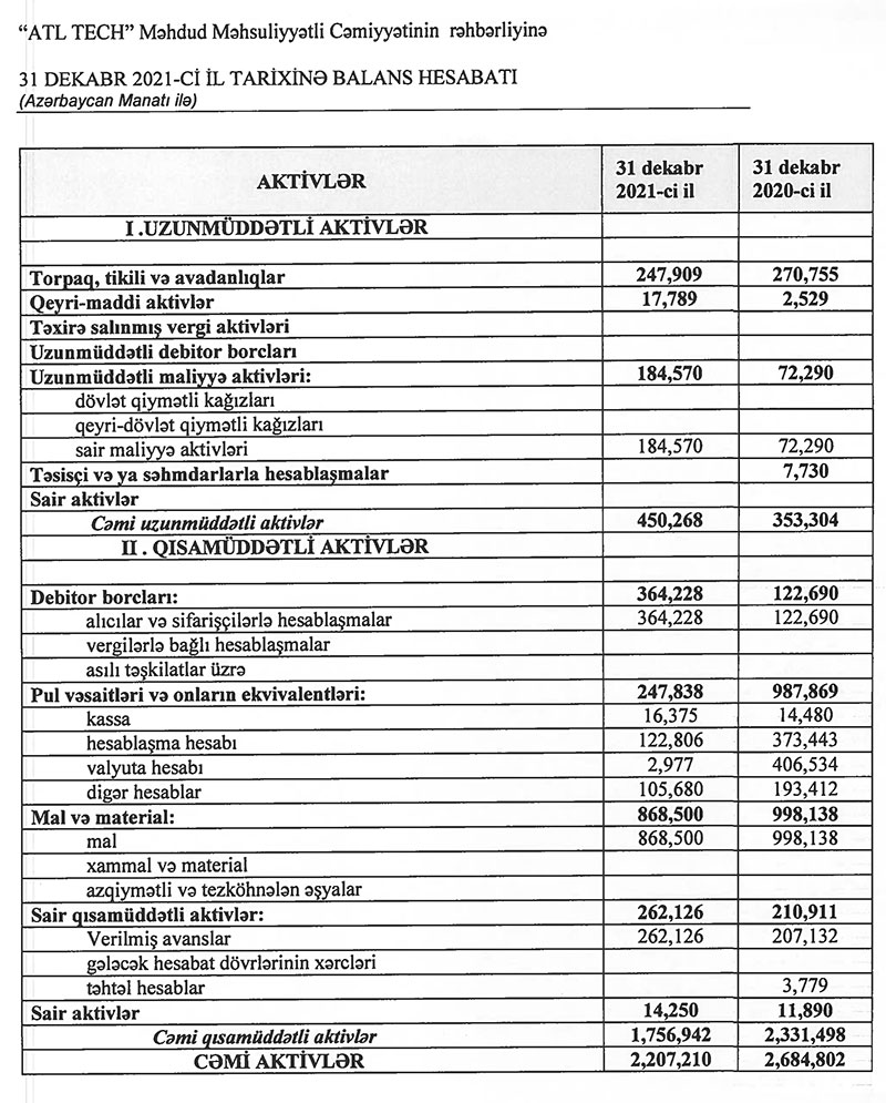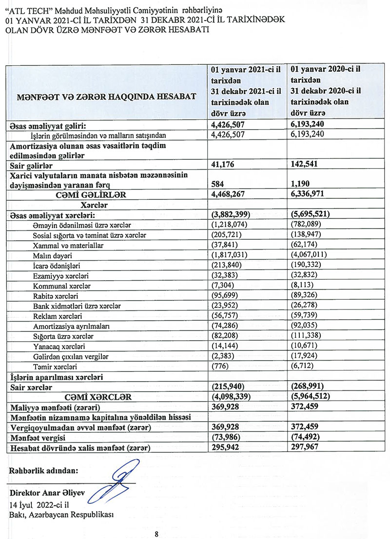 2021-ci ildə "ATL Tech"in cəmi gəlirləri 4 milyon 468 min manat, cəmi xərcləri 4 milyon 172 min manat təşkil edib. 2020-ci ildə Şirkətin cəmi gəlirləri 6 milyon 337 min manat, cəmi xərcləri 6 milyon 39 min manat təşkil etmişdi.