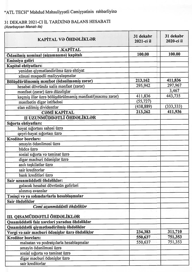 İnsan resursları, əlaqə mərkəzi, süni intellekt və biznesin idarə edilməsi üzrə həllər təqdim edən "ATL Tech" MMC şirkəti 2021-ci ili 296 min manat xalis mənfəət ilə başa vurub. Şirkət 2020-ci ili 298 min manat xalis mənfəət ilə bağlamışdı.