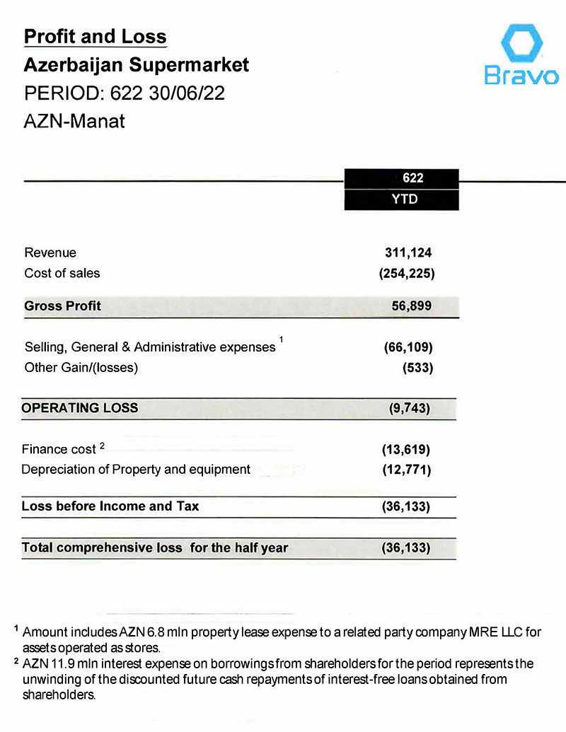 "Bravo" şəbəkəsini idarə edən "Azərbaycan Supermarket" MMC şirkəti 2022-ci ilin birinci yarısı (yanvar-iyun) üzrə maliyyə göstəricilərini açıqlayıb.