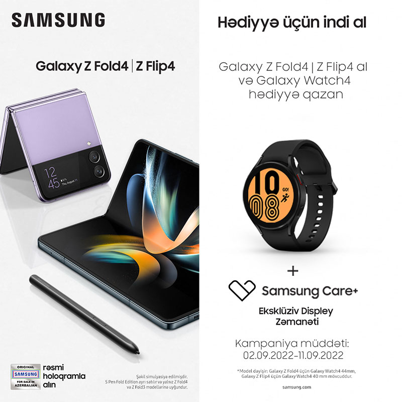 Şirkətdən verilən məlumata görə, avqustun 10-da bütün dünyaya təqdim olunan cihazlara istifadəçilərin marağı gözləntiləri üstələyib və bu səbəbdən sentyabrın 9-dək Azərbaycanda Samsung distribyutor mağazalarının hər hansı birindən yeni cihaz alan hər kəs hədiyyə olaraq Galaxy Watch4 və Samsung Care+ Eksklyüziv Displey Zəmanətini əldə edəcək.