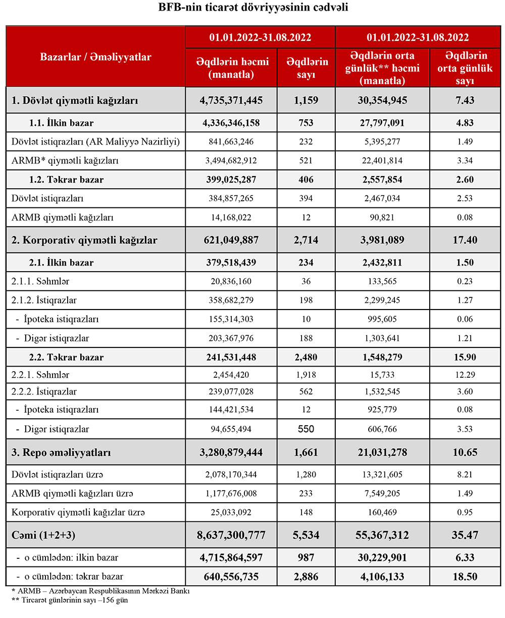 Bakı Fond Birjasında (BFB) 01.01.2022-31.08.2022 tarixləri ərzində qiymətli kağızlar üzrə keçirilən əməliyyatların ümumi həcmi 8 milyard 637 milyon 300 min 777 manat təşkil edib. Xatırladaq ki, Bakı Fond Birjasında 2021-ci ilin 01.01.2021-31.08.2021 tarix ərzində qiymətli kağızlar üzrə keçirilən əməliyyatların ümumi həcmi 10 milyard 690 milyon 684 min 135 manat təşkil etmişdi.