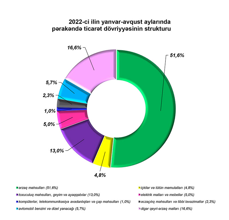 2022-ci ilin yanvar-avqust aylarında alıcıların pərakəndə ticarət şəbəkələrində aldıqları mallara xərclədiyi vəsaitin 51,6 faizi ərzaq məhsullarının, 4,8 faizi içkilər və tütün məmulatlarının, 13,0 faizi toxuculuq məhsulları, geyim və ayaqqabıların, 5,7 faizi avtomobil benzini və dizel yanacağının, 5,0 faizi elektrik malları və mebellərin, 2,3 faizi əczaçılıq məhsulları və tibbi ləvazimatların, 1,0 faizi kompüterlər, telekommunikasiya avadanlıqları və çap məhsullarının, 16,6 faizi isə digər qeyri-ərzaq mallarının alınmasına sərf olunmuşdur.