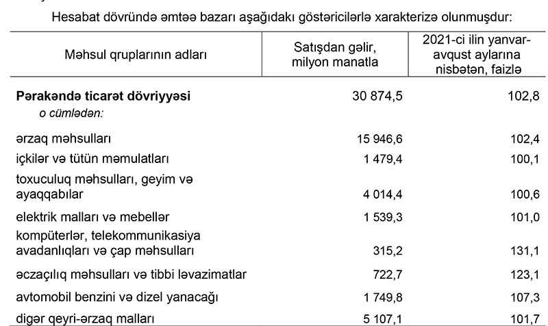 Dövlət Statistika Komitəsinin məlumatına görə, 2021-ci ilin yanvaravqust ayları ilə müqayisədə pərakəndə ticarət dövriyyəsi real ifadədə 2,8 faiz, o cümlədən ərzaq məhsulları, içkilər və tütün məmulatları üzrə 2,2 faiz, qeyri-ərzaq malları üzrə 3,6 faiz artmışdır.