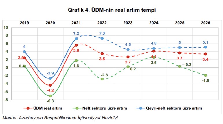 Marja xəbər verir ki, proqnozlara əsasən ortamüddətli dövrdə ölkədə qeyri-neft ÜDM-nin həcminin 2023-cü ilin sonuna 73,1 milyard manat, 2026-cı ildə isə 92,3 milyard manata qədər artacağı və real artım tempinin 4,5-5,1 faiz intervalında olacağı gözlənilir (Qrafik 4). 2023-2024-cü illərdə qaz hasilatının artması neft-qaz ÜDM-nin artımını dəstəkləyərək real artım tempinin 2023-cü il üzrə 0,2, 2024-cü ildə 2,6 faizə qədər artmasına, 2026-cı ildə isə azalan hasilat göstəriciləri neft-qaz ÜDM-nin geriləməsinə (-1,9 faiz) səbəb olacaqdır. 2026-cı ilə doğru ÜDM-nin real artım tempinin tədricən zəifləməsi neft-qaz ÜDM üzrə real artım tempinin azalan dinamikasından qaynaqlanacaqdır.