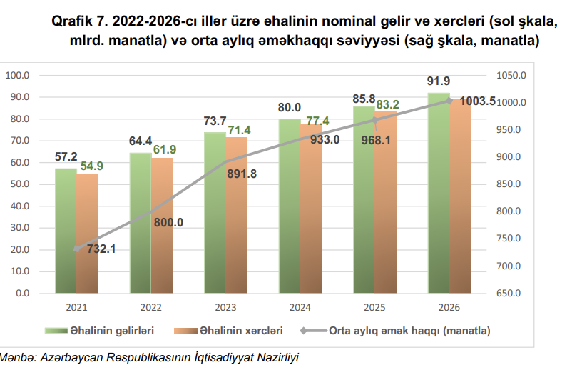 Eyni zamanda, inflyasiya səviyyəsinin tənzimlənməsi ortamüddətli dövrdə əhalinin sosial rifah göstəricilərinə də müsbət təsir göstərəcəkdir. Proqnozlara əsasən növbəti il və sonrakı üç ildə əhalinin gəlirlərinin artaraq 2026-cı ildə 91,9 milyard manata, xərclərinin isə 89,2 milyard manata qədər yüksəlməsi gözlənilir.