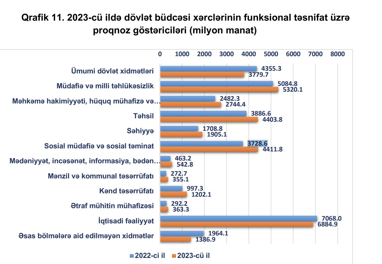2023-cü ildə dövlət büdcəsi xərclərinin funksional təsnifat üzrə proqnoz göstəricilərinə görə, sosial müdafiə və sosial təminat xərcləri 683.2 milyon manat artımla 4 milyard 411.8 milyon manat proqnozlaşdırılır.