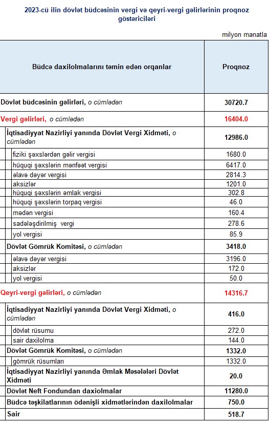 2023-cü ilin dövlət büdcəsinin vergi və qeyri-vergi gəlirlərinin proqnoz göstəriciləri açıqlanıb.