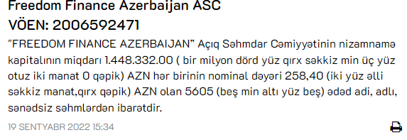 İndiyədək "Freedom Finance Azerbaijan ASC-nin nizamnamə kapitalı 598 min 454,40 manat təşkil edirdi.