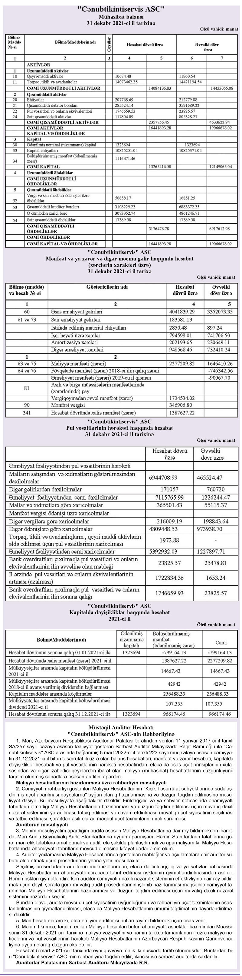 "Cənubtikintiservis" ASC 2021-ci ili 1 milyon 388 min manat xalis mənfəət ilə başa vurub. Halbuki, şirkət 2020-ci ili 1 milyon 646 min manat maliyyə mənfəəti ilə bağlamışdı. "Cənubtikintiservis" 2020-ci il mənfəətinin hamısını 2018-ci və 2019-cu illərin zərərini bağlamağa yönəltmişdi.