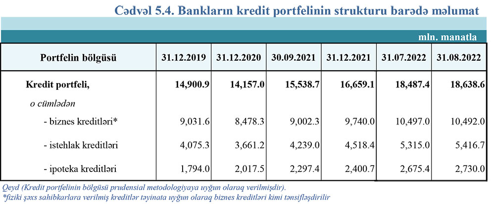 2022-ci ilin 8 ayı ərzində bank sektorunun cəmi kredit portfeli 1 milyard 979.5 milyon manat, o cümlədən biznes kreditləri 752 milyon manat, istehlak kreditləri 898,3 milyon manat, ipoteka kreditləri isə 329,3 milyon manat artıb.