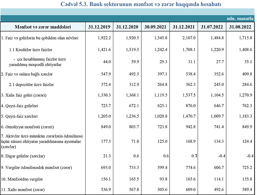 Azərbaycanın bank sektoru 2022-ci ilin 8 ayını (yanvar-avqust) dövrünü 589.4 milyon manat xalis mənfəət ilə başa vurub. Xalis mənfəətin artması gəlirlərin artmasından qaynaqlanır.