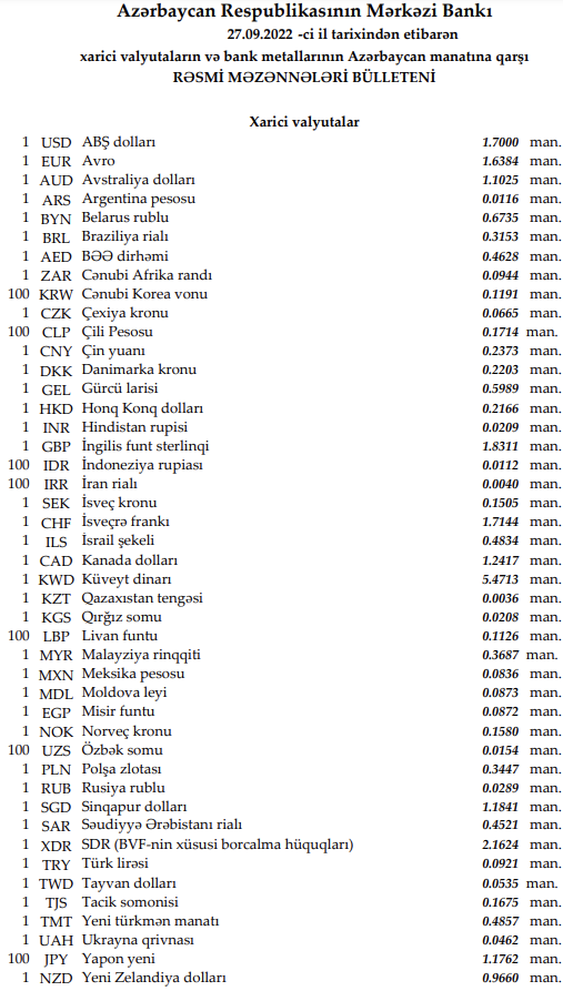 Dolların bazar ertəsi üçün rəsmi məzənnəsi müəyyən olunub
