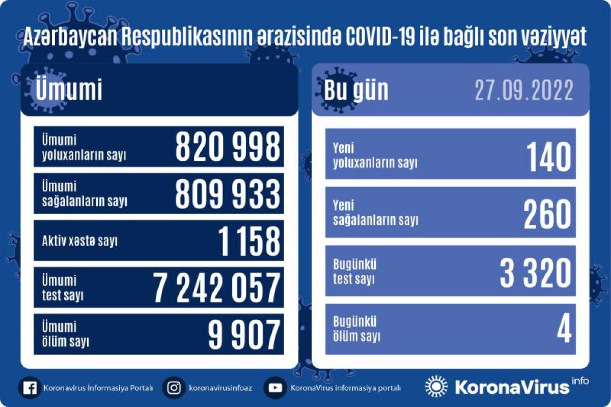 Azərbaycan Respublikasında koronavirus (COVID-19) infeksiyasına 140 yeni yoluxma faktı qeydə alınıb, 260 nəfər müalicə olunaraq sağalıb.