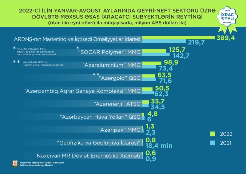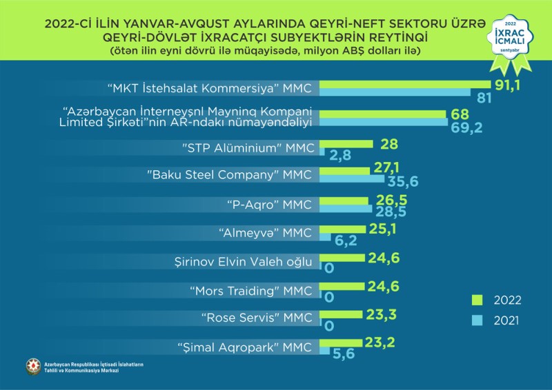 2022-ci ilin yanvar-avqust ayları üzrə hazırlanan qeyri-dövlət ixracatçı subyektlərin reytinqində ilk onluqda aşağıdakı şirkətlər təmsil olunurlar: “MKT İstehsalat Kommersiya” MMC, “Azərbaycan İnterneyşnl Mayninq Kompani Limited Şirkəti”nin Azərbaycan Respublikasındakı Nümayəndəliyi, “STP Alüminium” MMC, “Baku Steel Company” MMC, “P-Aqro” MMC, “Almeyvə” MMC, Şirinov Elvin Valeh oğlu, “Mors Trading” MMC, “Rose Servis” MMC, “Şimal AqroPark” MMC.