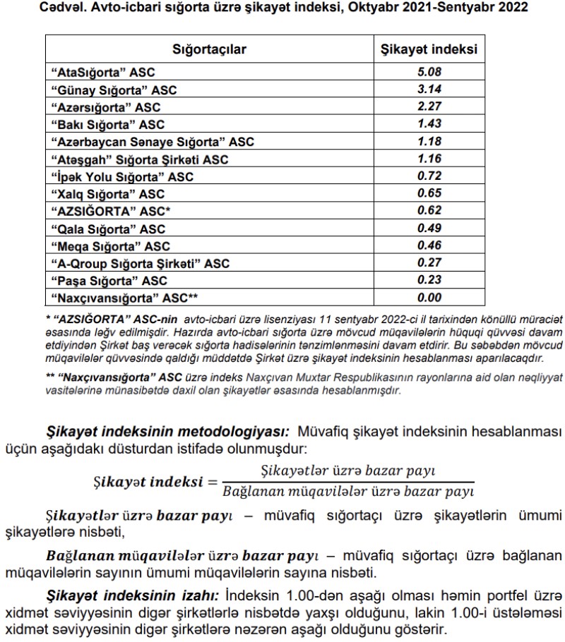 Şikayət indeksi açıqlandığı tarixdən son 12 ay ərzində əldə edilmiş məlumatlar əsasında hər bir sığortaçı üzrə hesablanacaqdır və aylıq məlumatlar əsasında yenilənəcəkdir.