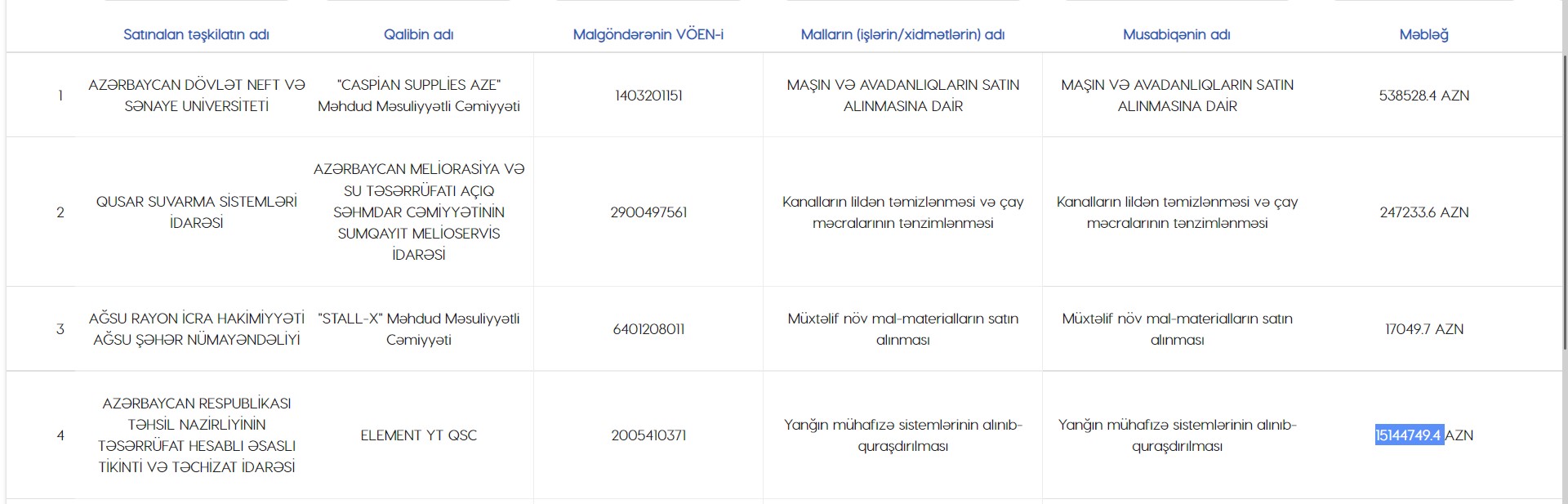 Nazirlik qalib şirkət ilə məbləği 15 milyon 144 min 749.4 manatdır.