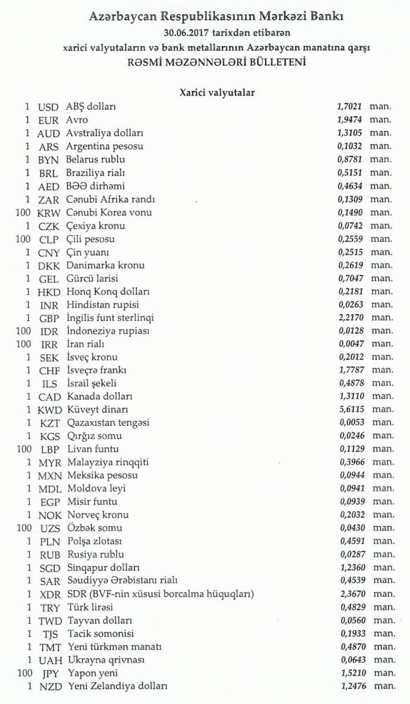 İyunun 30-na Mərkəzi Bankın açıqladığı rəsmi Dollar/manat məzənnəsi İyunun 29-u ilə müqayisədə düşərək 1,7021 manat olub, Avro/manat məzənnəsi 1.9474 manata qalxıb.