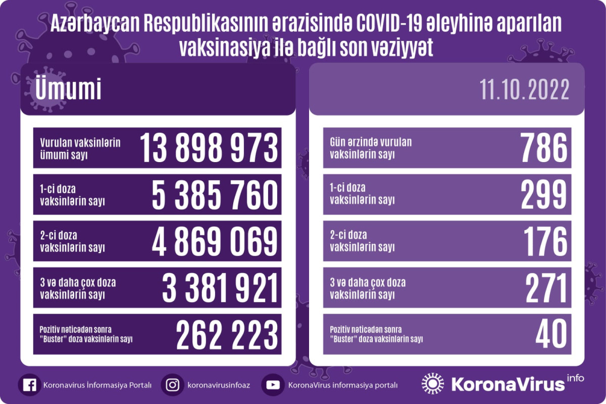 Azərbaycanda son sutkada koronavirus (COVID-19) əleyhinə 786 vaksin vurulub. Bir gündə birinci mərhələ üzrə vaksinasiya olunanların sayı 299, ikinci mərhələ üzrə vaksinasiya olunanların sayı 176, üç və daha çox doza üzrə vaksinasiya olunanların sayı 271, pozitiv nəticədən sonra buster doza üzrə vaksinasiya olunanların sayı 40 nəfərdir.