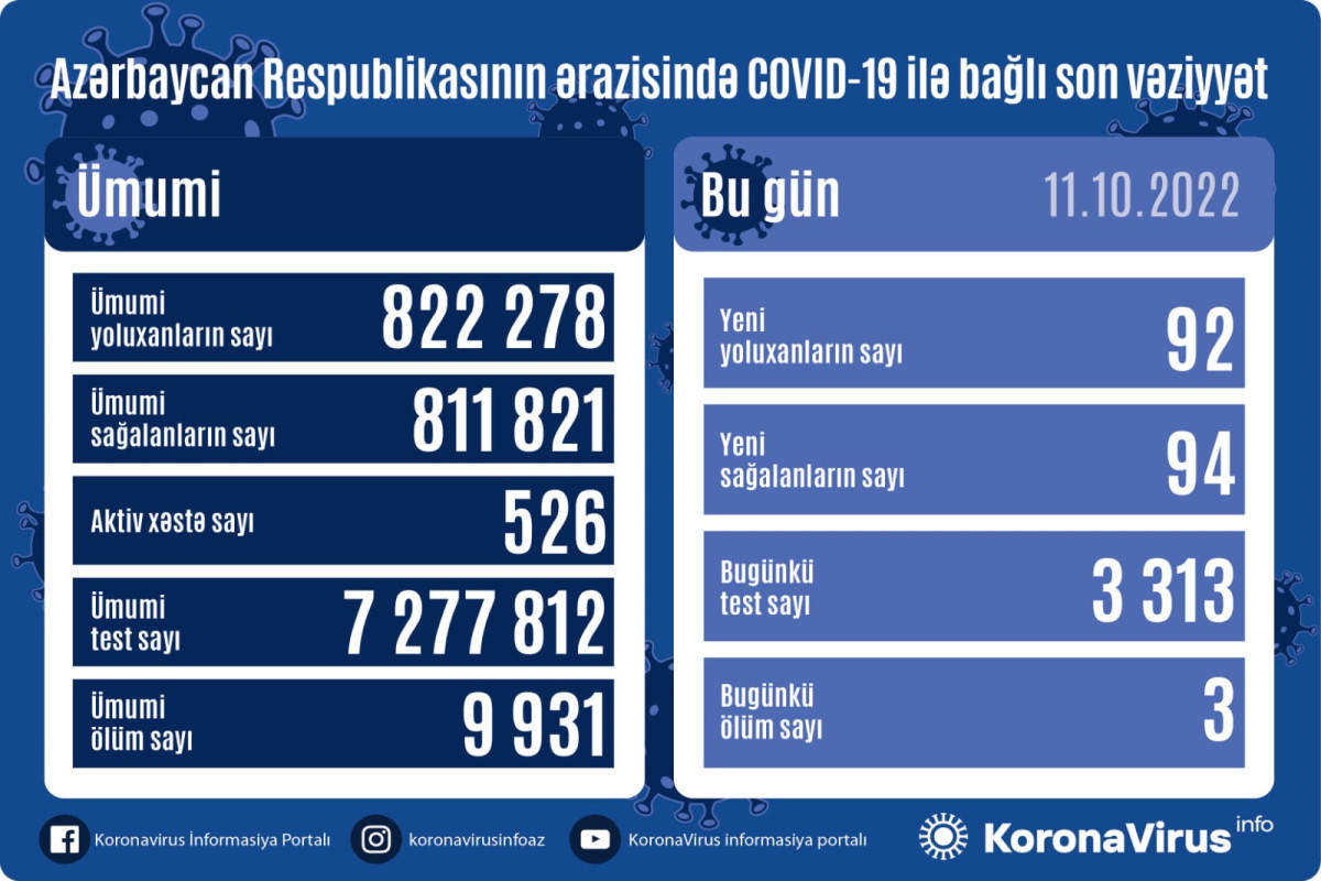 Azərbaycan Respublikasında koronavirus (COVID-19) infeksiyasına 92 yeni yoluxma faktı qeydə alınıb, 94 nəfər müalicə olunaraq sağalıb.