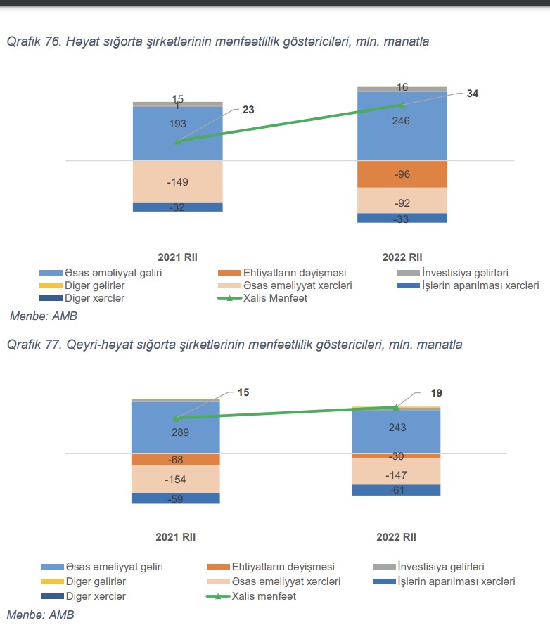 "Belə ki, sektorun xalis mənfəəti 47% və ya 11 milyon manat artaraq 34 milyon manat təşkil etmişdir. Mənfəətlilik əsasən yarımil ərzində əməliyyat gəlirlərinin 53 milyon manat artımı, əməliyyat xərclərinin isə 57 milyon manat azalması hesabına təmin edilib. Mənfəətliyə mənfi təsir edən amil isə 97 milyon manat məbləğində ehtiyatların dəyişməsi olmuşdur. Qeyri-həyat sektorunun mənfəətliyi isə 31% (4.6 milyon manat) artaraq 19.4 milyon manat təşkil etmişdir. Bu artımın əsas drayveri kimi xalis sığorta ehtiyatında dəyişmələrin ötən illə müqayisədə 56% (38 milyon manat) azalması çıxış etmişdir. Eyni zamanda, əsas əməliyyat xərclərinin 7.8 milyon manat azalması və digər gəlirlərin 2.7 milyon manat artması xalis mənfəətin artımını şərtləndirmişdir".