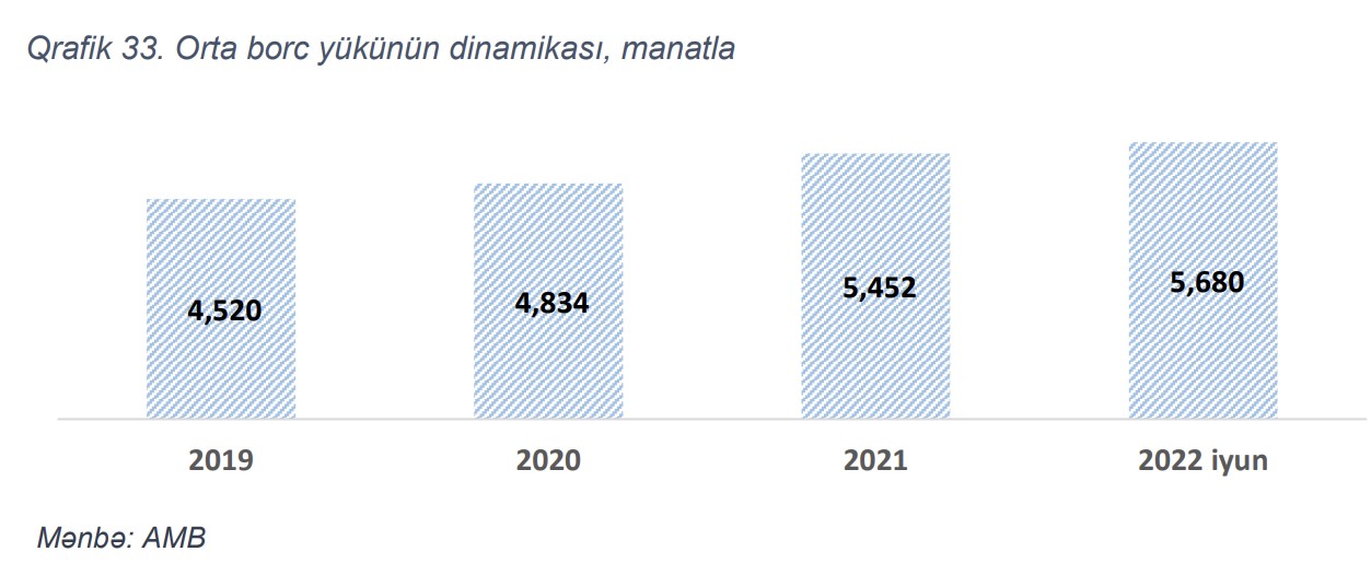 Hesabatda qeyd edilib ki, orta borc yükü 2019-cu ilin sonunda 4520 manat, 2021-ci ilin sonunda 5452 manat ikən, 2022-ci ilin İyun ayının sonunda 5680 manata çatıb. Hesablama qalıq borcu 500 – 150 000 manat intervalında olan borclanlar üzrə aparılmışdır (FİN üzrə.