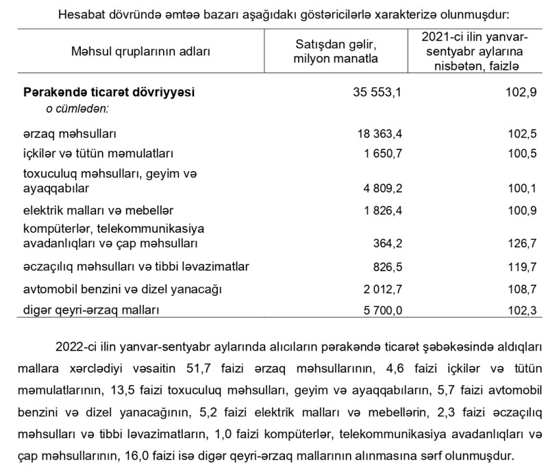 2022-ci ilin yanvar-sentyabr aylarında alıcıların pərakəndə ticarət şəbəkəsində aldıqları mallara xərclədiyi vəsaitin 51,7 faizi ərzaq məhsullarının, 4,6 faizi içkilər və tütün məmulatlarının, 13,5 faizi toxuculuq məhsulları, geyim və ayaqqabıların, 5,7 faizi avtomobil benzini və dizel yanacağının, 5,2 faizi elektrik malları və mebellərin, 2,3 faizi əczaçılıq məhsulları və tibbi ləvazimatların, 1,0 faizi kompüterlər, telekommunikasiya avadanlıqları və çap məhsullarının, 16,0 faizi isə digər qeyri-ərzaq mallarının alınmasına sərf olunmuşdur.
