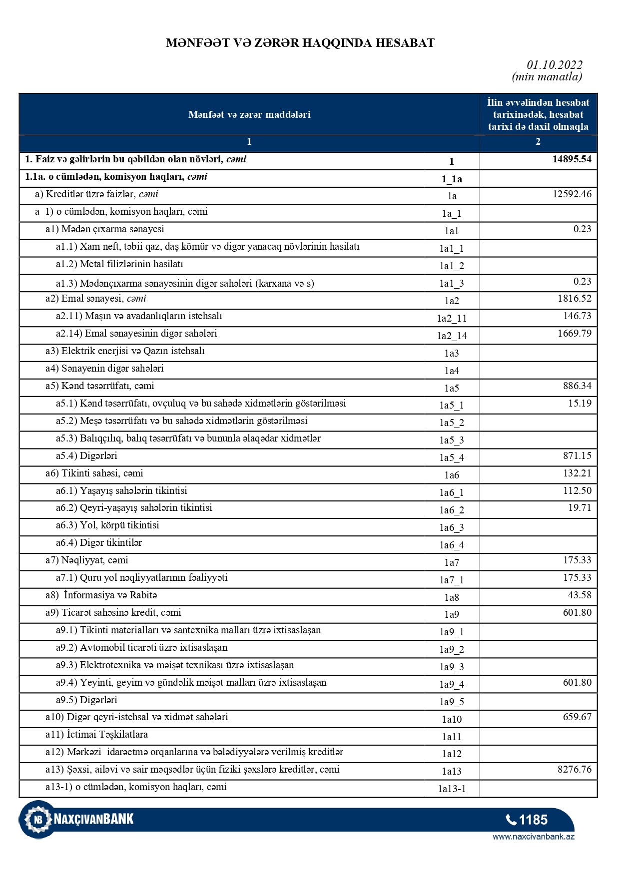 "Naxçıvanbank" ASC 2022-ci ilin 9 ayını 12 milyon 441 min manat xalis mənfəət ilə başa vurub. Ötən ilin eyni dövrü ilə müqayisədə Bankın xalis mənfəəti 2,1 dəfə artıb.