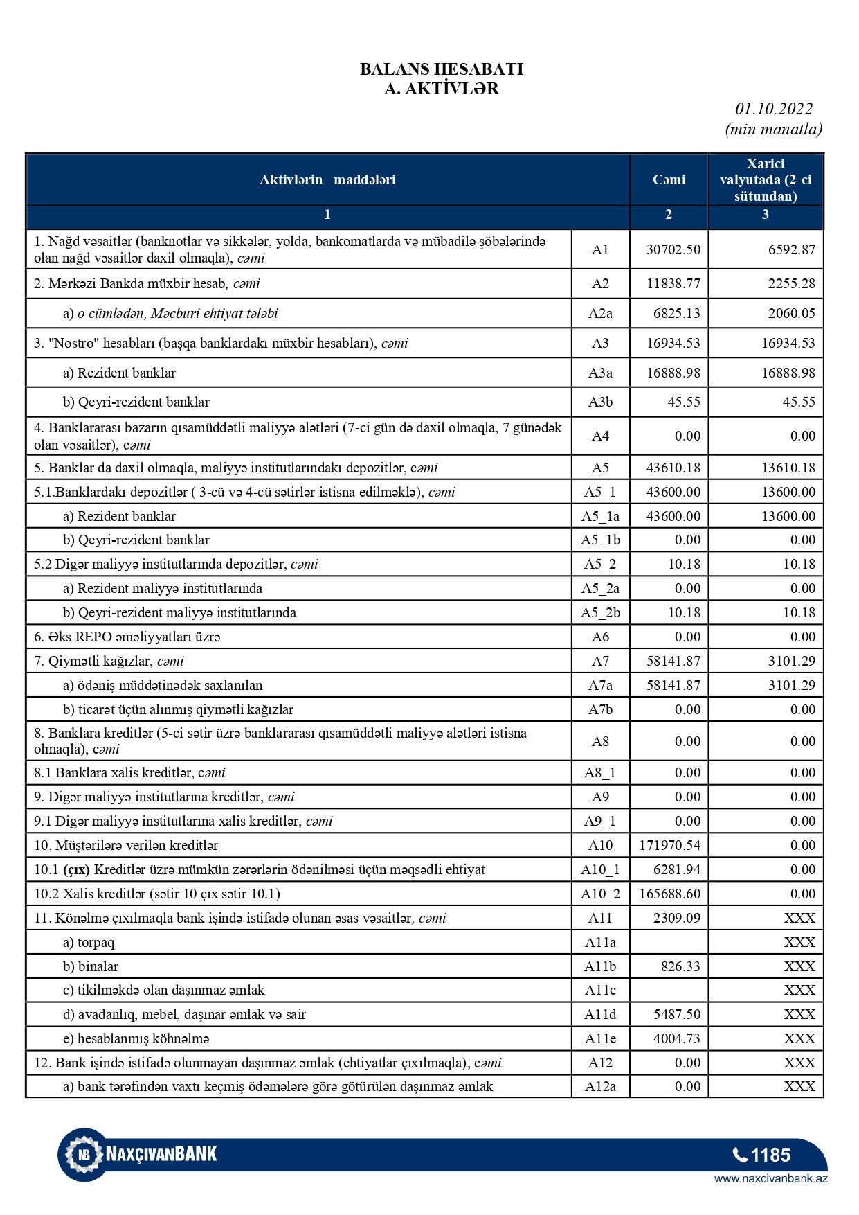 30 Sentyabr 2022-ci il tarixində "Naxçıvanbank" ASC 343 milyon 202 min manat cəmi aktivlərə, o cümlədən 171 milyon 970 min manat kredit portfelinə (müştərilərə verilən kreditlər) malik olub. Bank ötən ilin eyni tarixində 308 milyon 905 min manat cəmi aktivlərə, o cümlədən 124 milyon 977 min manat kredit portfelinə malik idi. Müqayisə olunan dövrdə "Naxçıvanbank"ın kredit portfeli 46 milyon 993 min manat və ya 37,6% artıb.