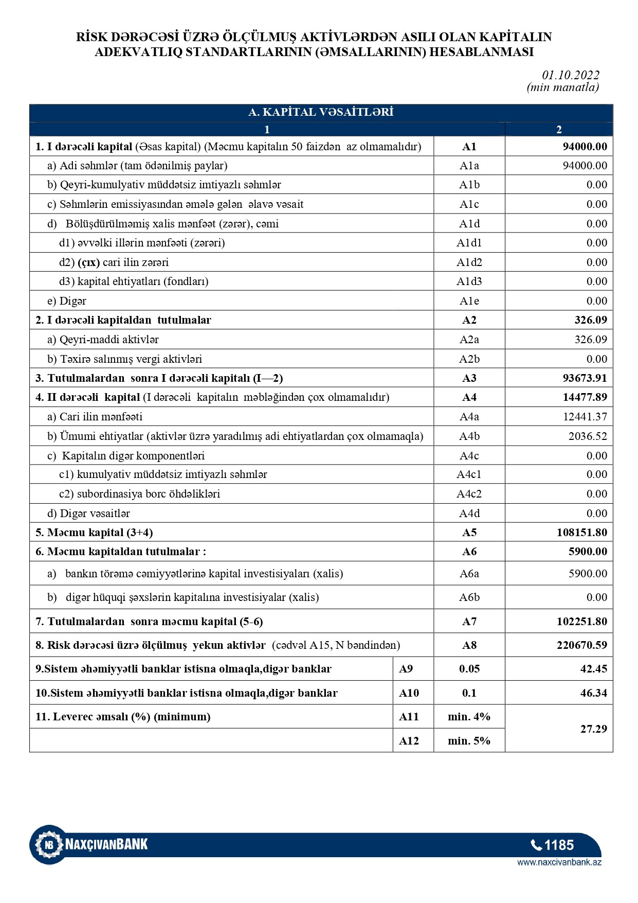 30 Sentyabr 2022-ci il tarixində "Naxçıvanbank" ASC 102 milyon 252 min manat məcmu kapitala malik olub. Bank 30 Sentyabr 2021-ci il tarixində 91 milyon 88 min manat məcmu kapitala malik idi.