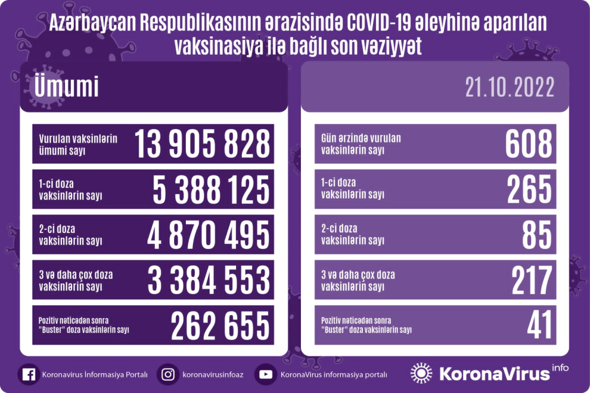 Azərbaycanda son sutkada koronavirus (COVID-19) əleyhinə 608 vaksin vurulub. Bir gündə birinci mərhələ üzrə vaksinasiya olunanların sayı 265, ikinci mərhələ üzrə vaksinasiya olunanların sayı 85, üç və daha çox doza üzrə vaksinasiya olunanların sayı 217, pozitiv nəticədən sonra buster doza üzrə vaksinasiya olunanların sayı 41 nəfərdir.